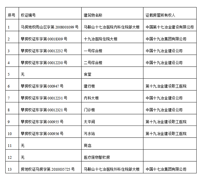 其中第1項和第13項房屋建筑物所占用的土地在下屬馬鞍山十七冶醫院無形資產土地使用權中進行評估。