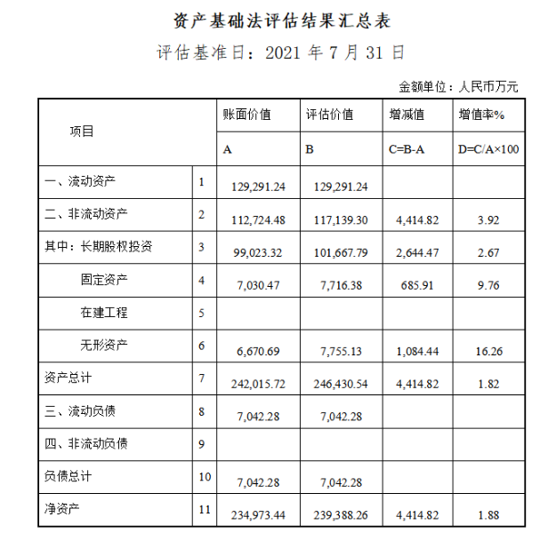 評估結論:本資產評估報告選用資產基礎法評估結果作為評估結論。具體評估結論如下: